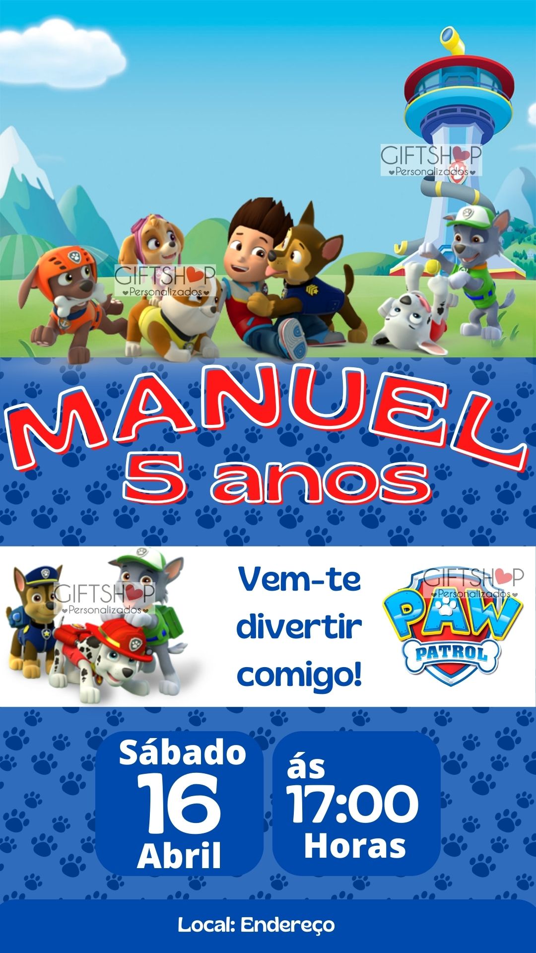 🎨 Personalizado com o tema da festa e os detalhes que quiser (nome, idade, data e morada).